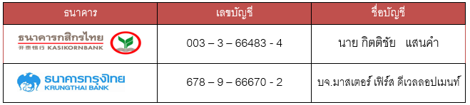 2. เงินเข้าบัญชี โดยโอนเงินผ่านเคาท์เตอร์ธนาคาร หรือ ATM ได้ 24 ชม. ตามที่ท่านสะดวกดังต่อไปนี้